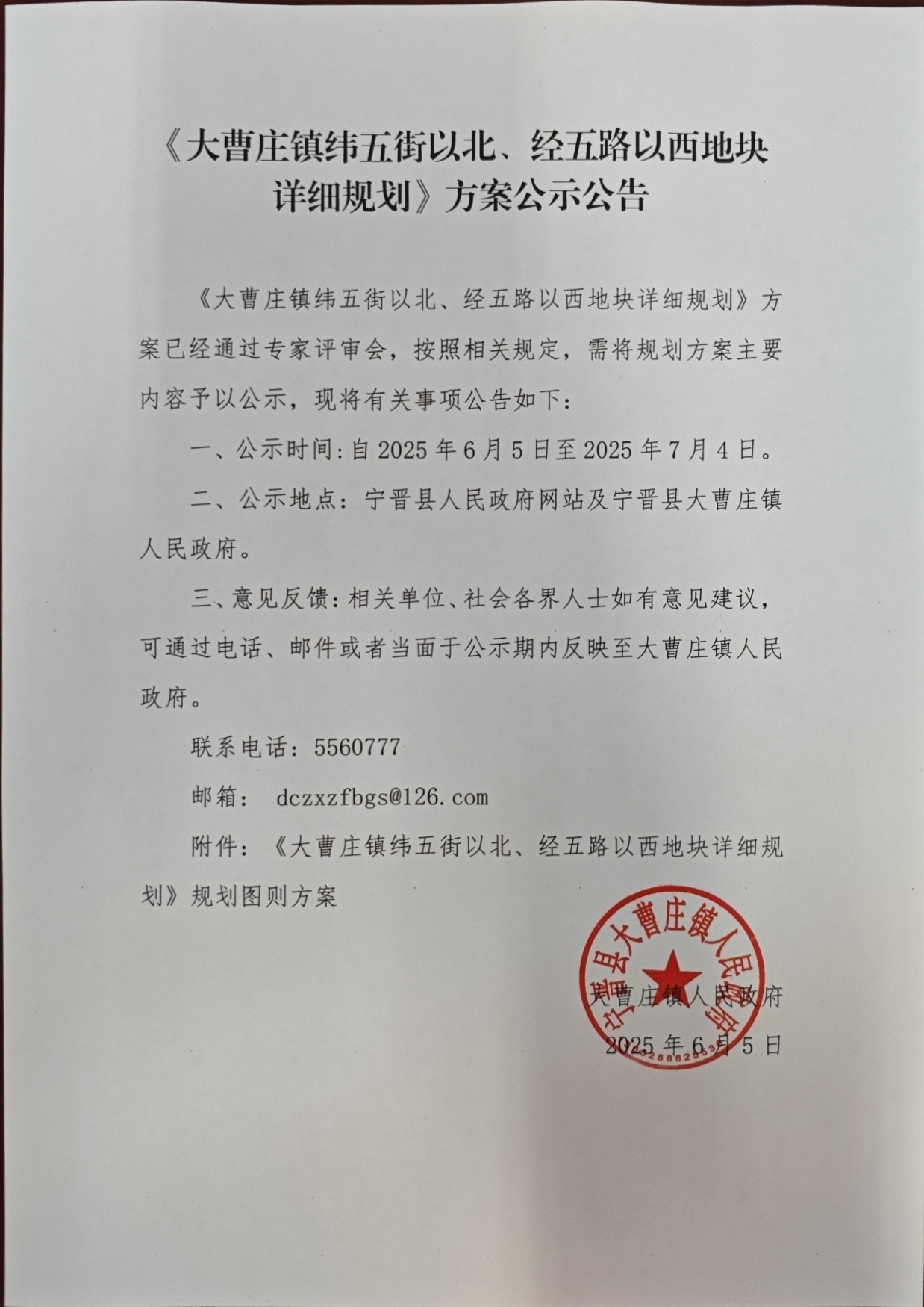 大曹庄镇纬五街以北、经五路以西地块详细规划公示