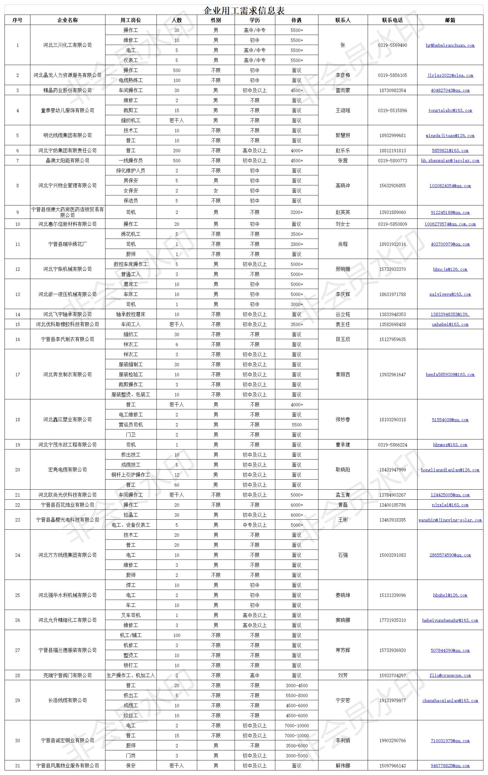 一、本次活动搜集整理了我县31家企业的就业岗位2013个,涵盖操作工、保安、门岗等多个工种。在宁晋县人民政府网“宁晋县人力资源和社会保障平台”及宁晋县人力资源市场微信公众号等信息平台发布。其他有用工意向的企业可随时提供相关信息,我们将补充发布用工信息。